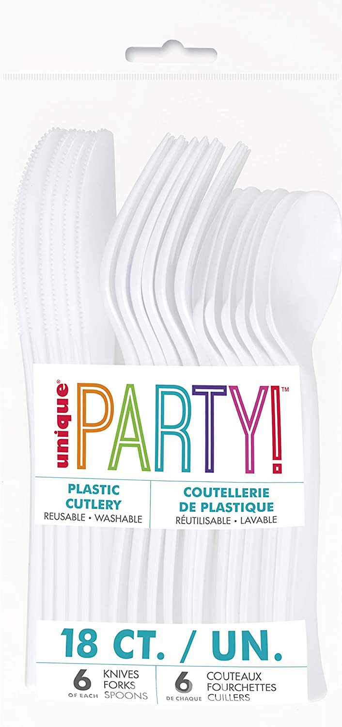 Plastic cutlery for parties in white, 6 spoons, 6 knives, 6 forks.