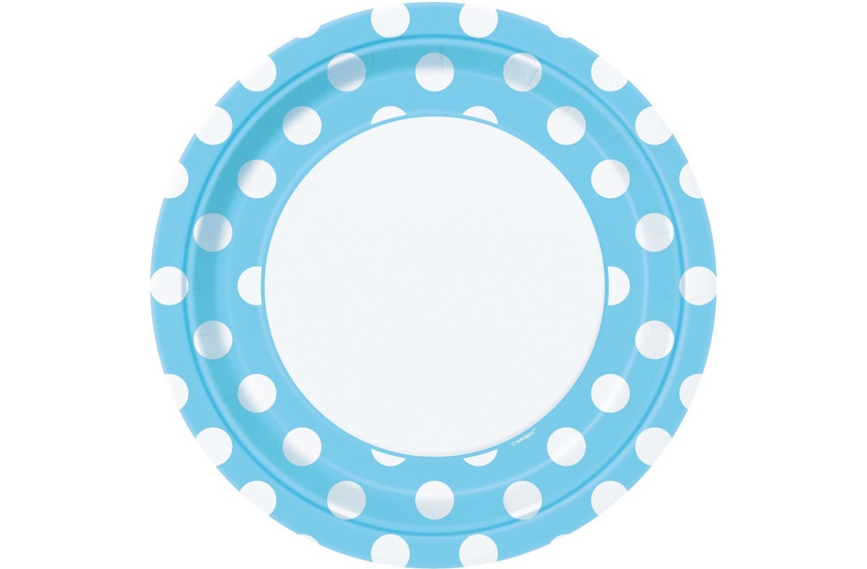 Set of eight ECO paper plates with a diameter of 23 cm in white with blue polka dots.