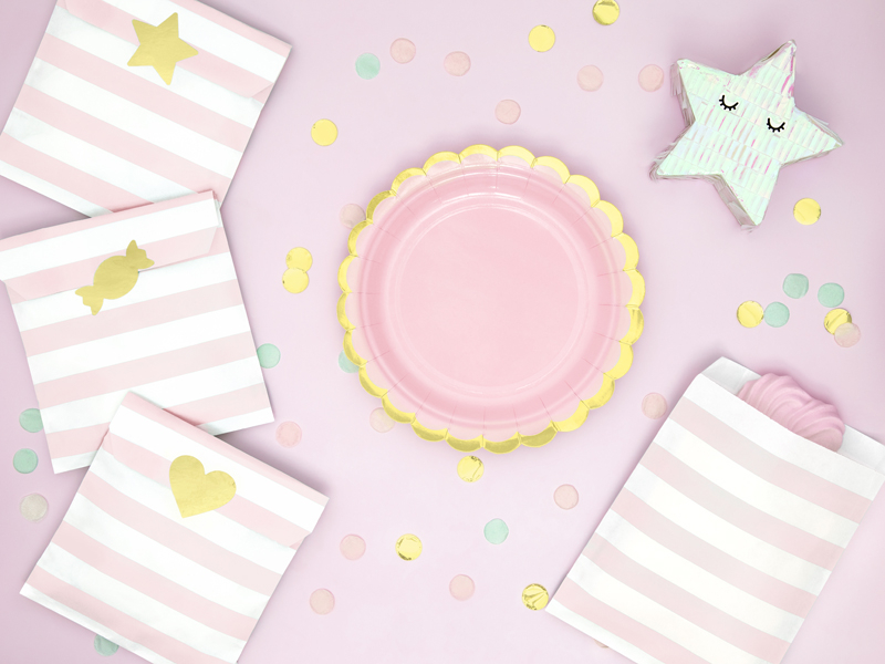 Paper plates in light pink with gold edges.