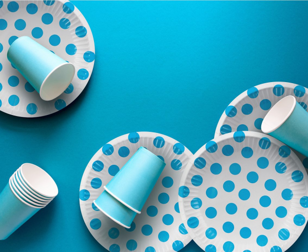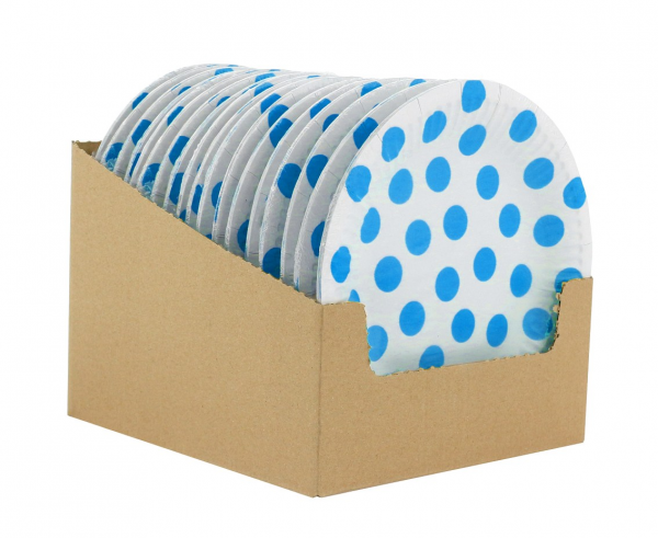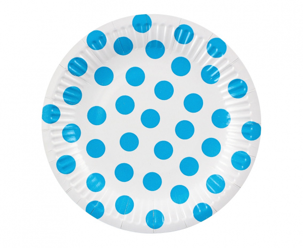 Set of six 18cm diameter paper plates in white with blue polka dots.