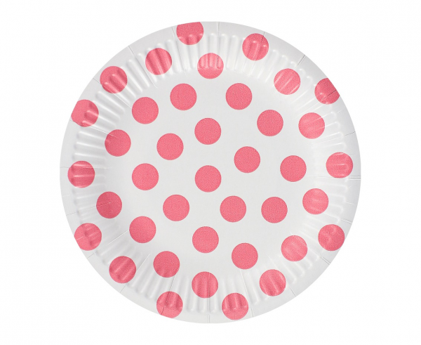 Set of six 18cm diameter white paper plates with pink polka dots.