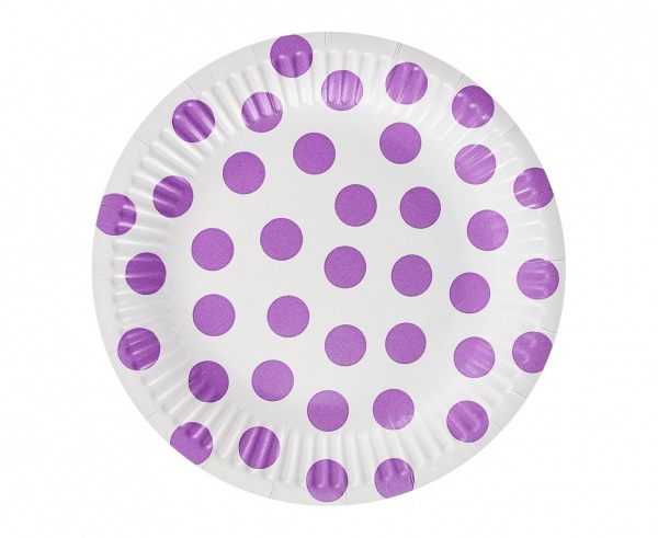 Set of six 18cm diameter paper plates in white with purple polka dots.
