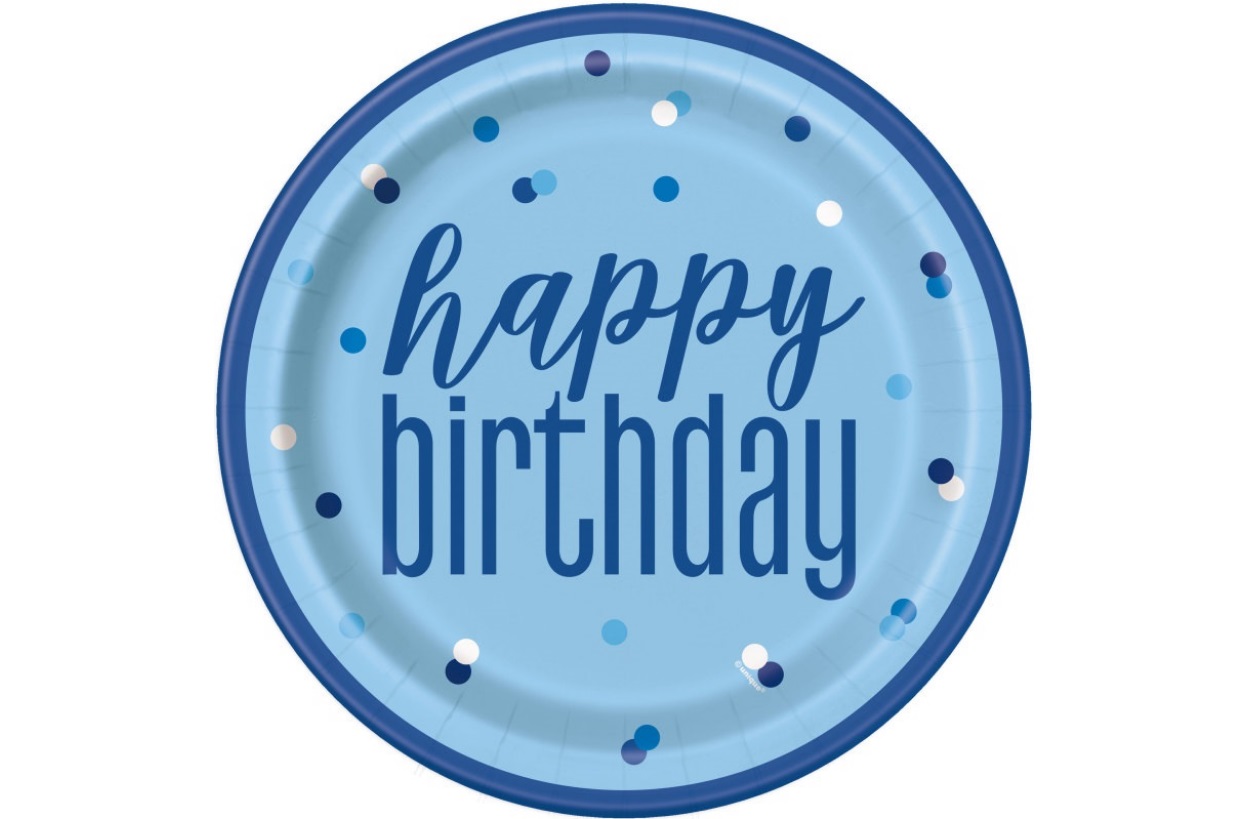 A set of eight 23cm diameter paper plates with the words Happy birthday in blue with dots.