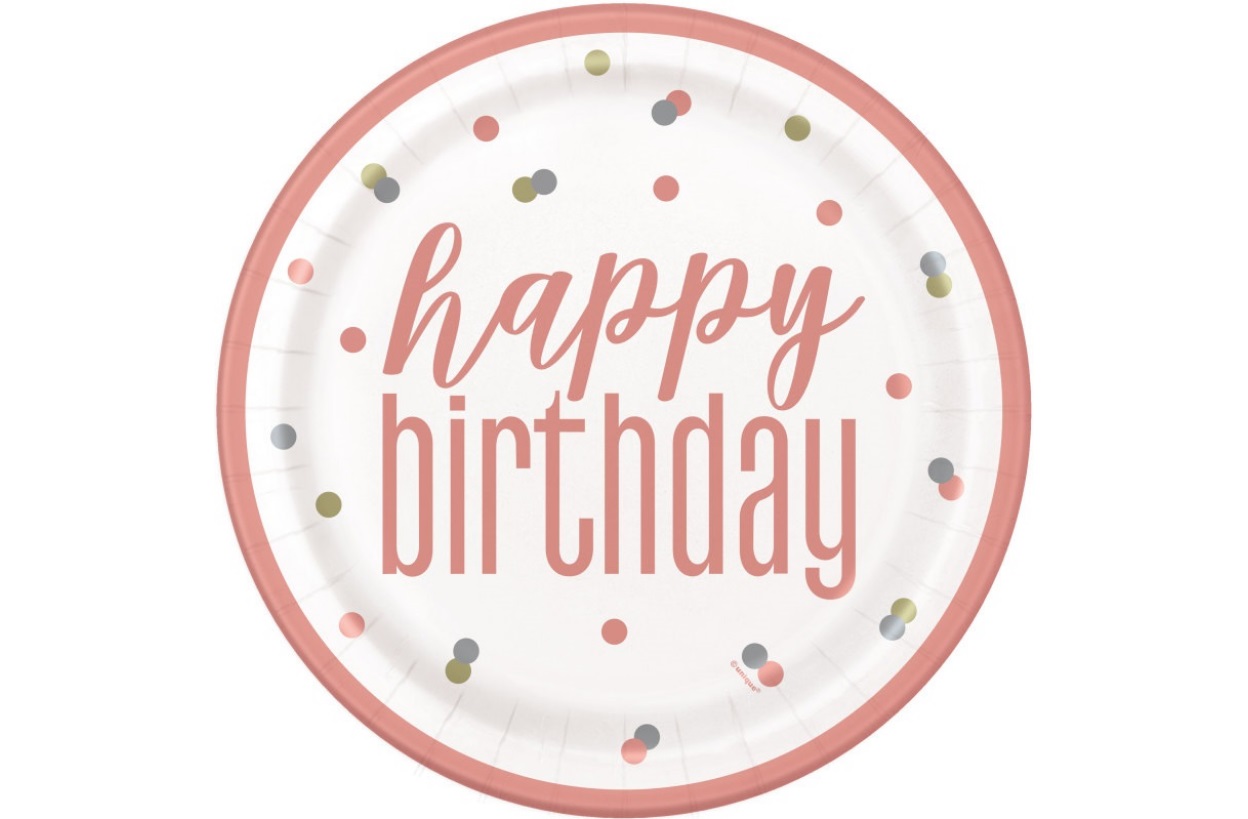 Set of eight paper plates with a diameter of 23 cm with the print Happy birthday in rosegold color.