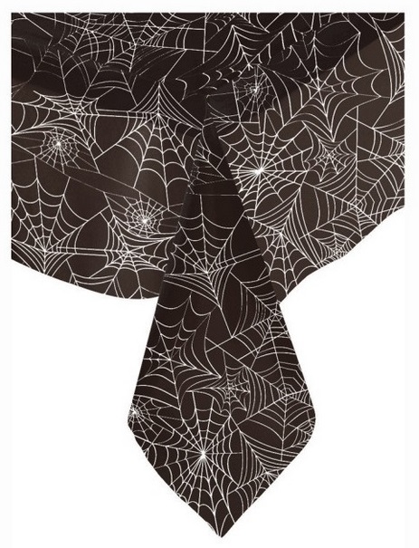 Plastic tablecloth in black with spider web print, dimensions 137x213cm.