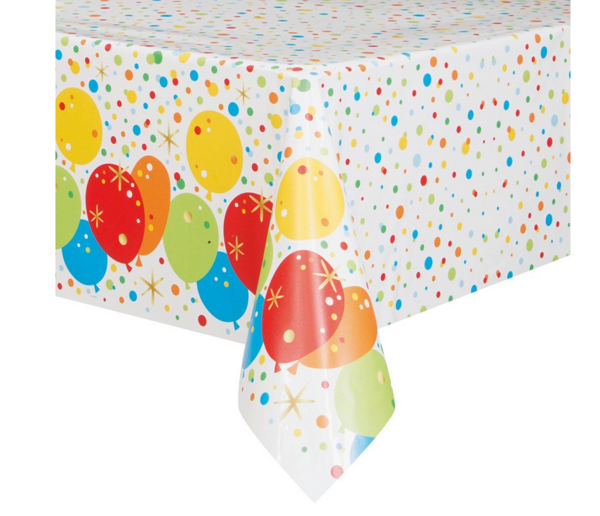 Foil tablecloth with colorful balloon print, dimensions 137x213cm.