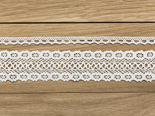 Cotton decorative lace in white color, 2 different designs of width 1cm and 4.5cm, each lace is about 1.5 meters long.