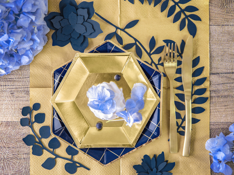 Decorative twigs with leaves in dark blue, made of paper in a mix of patterns.