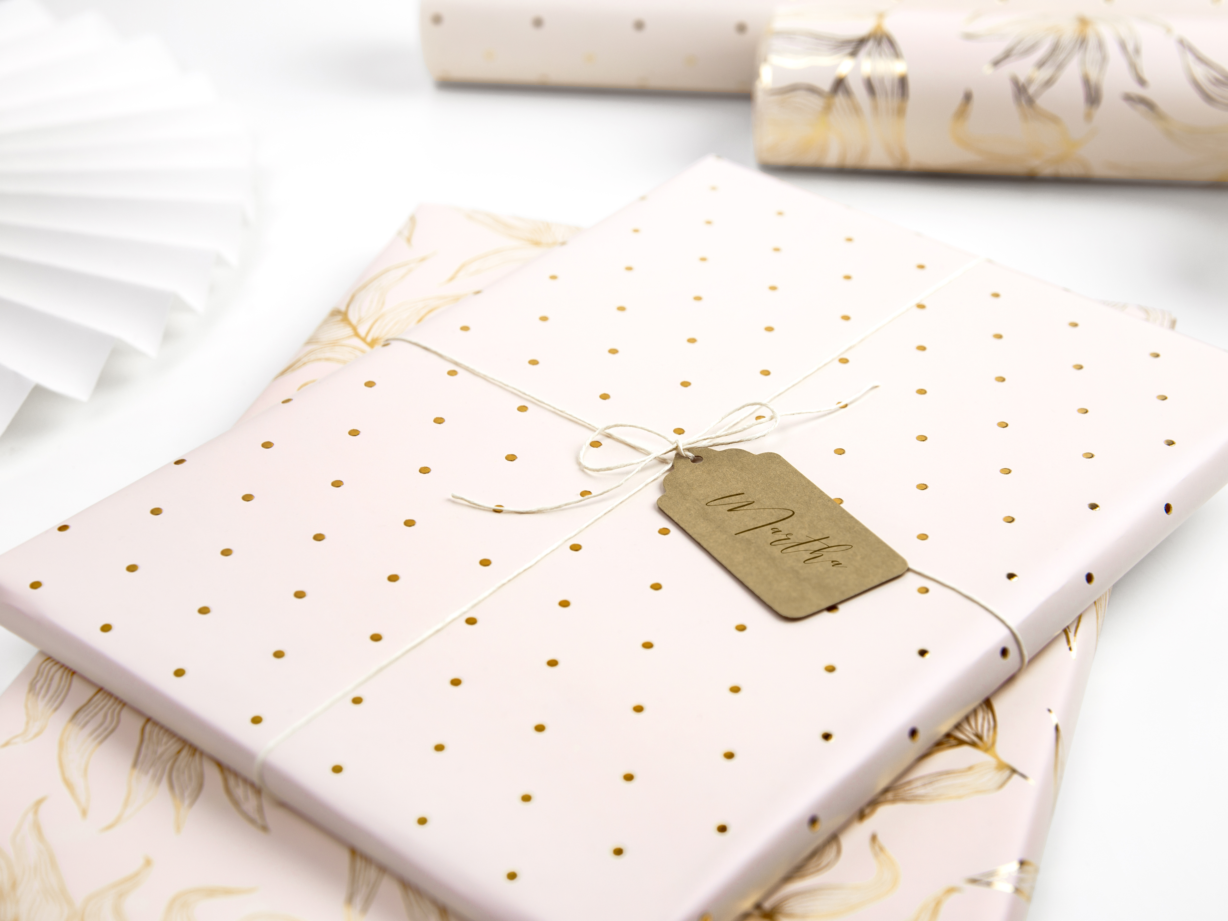 Wrapping paper, pink with gold metallized pattern (leaves and dots), height approx.