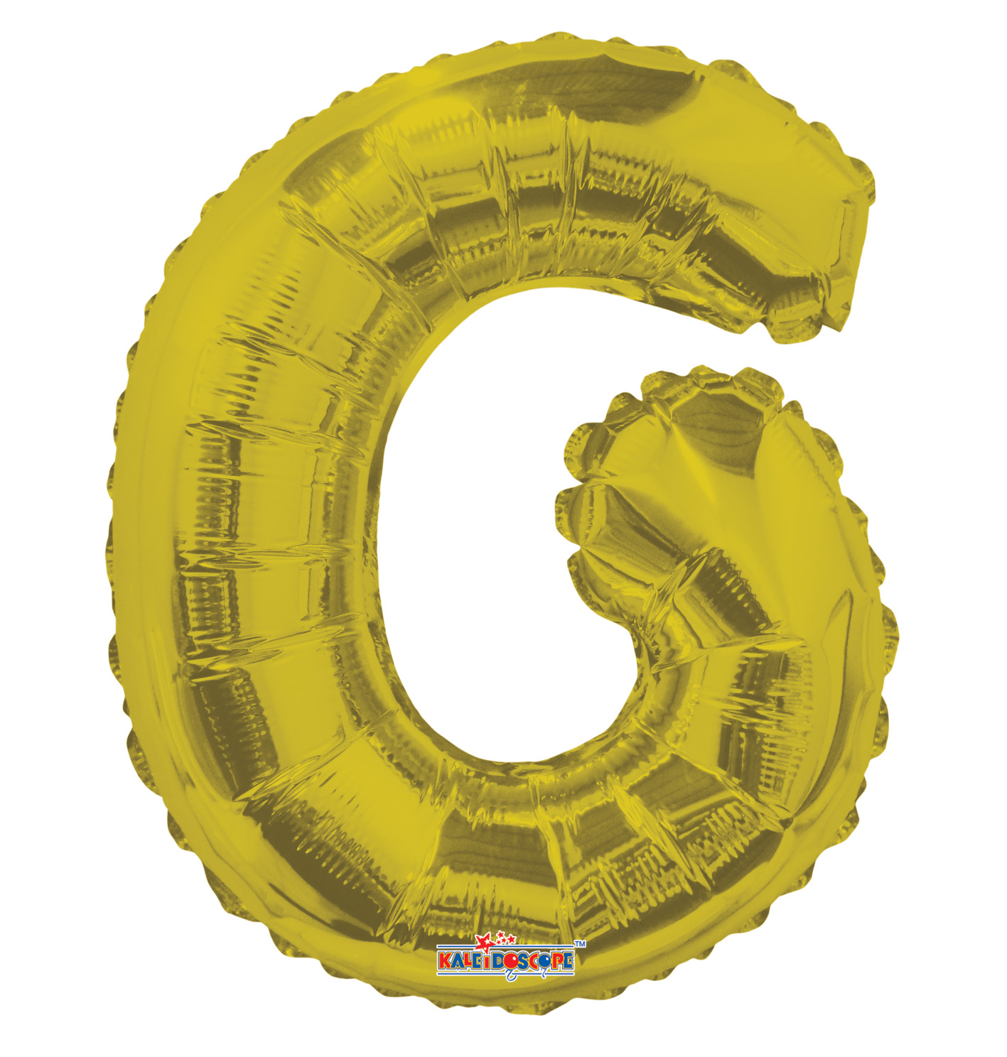 Foil balloon in shape of letter G in gold color.