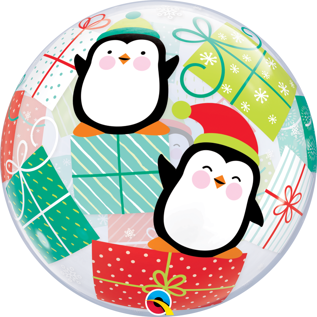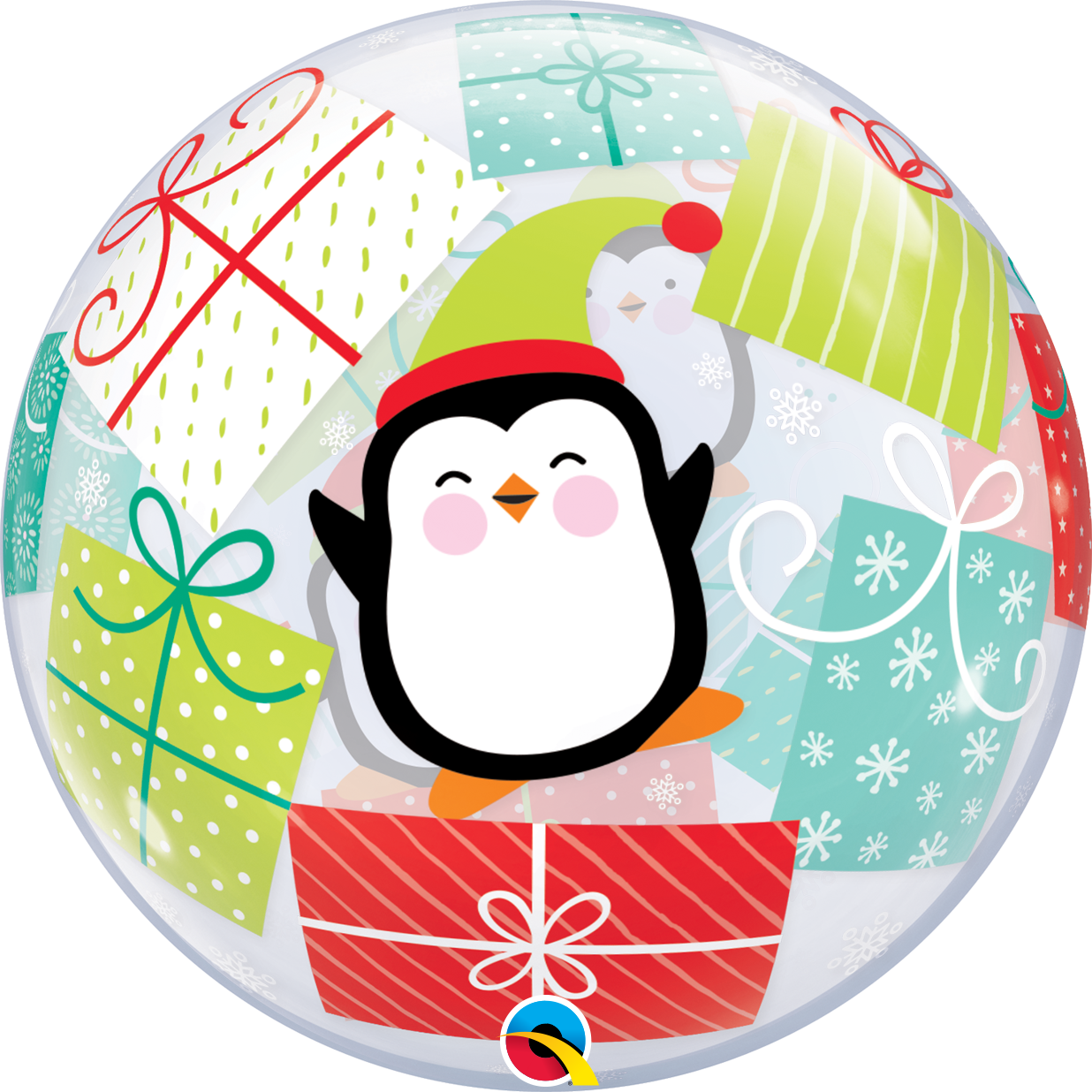 Bubble balloon with Christmass Penguins and gifts.