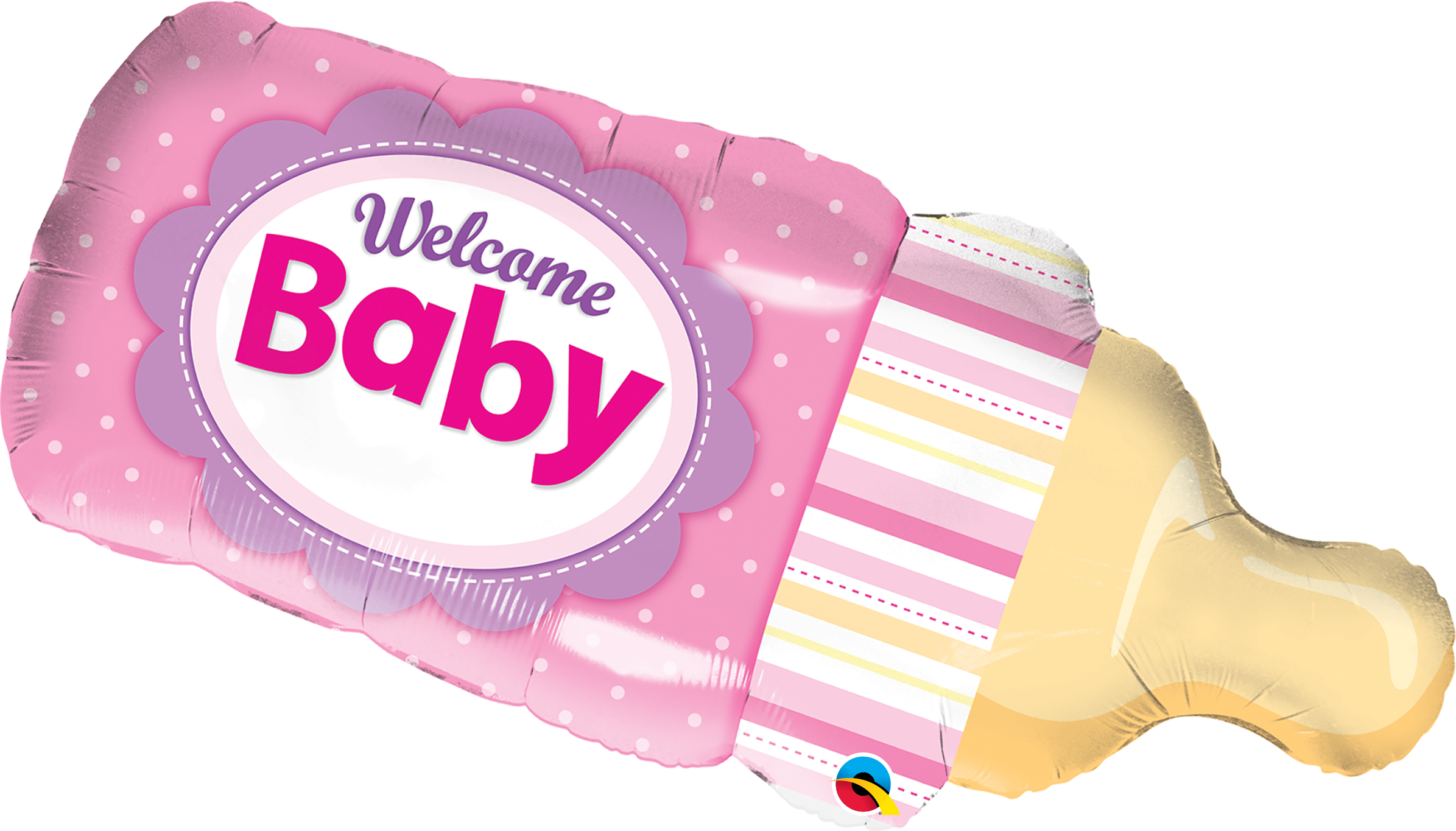 Foil balloon in the shape of baby bottle in pink color with inscription "Welcome baby".