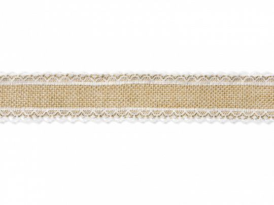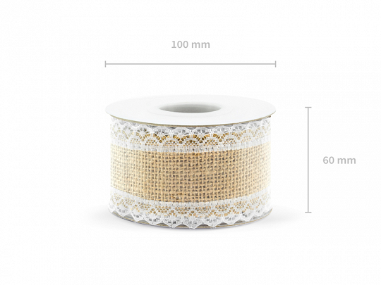 Jute ribbon with lace, the width of the ribbon is approx. 5 cm and the length is approx. 5 meters.