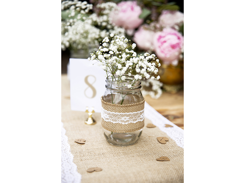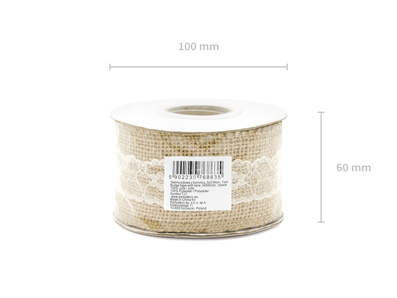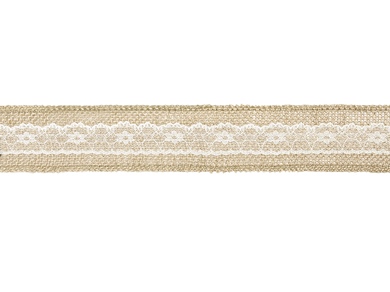 Jute ribbon with lace, the width of the ribbon is approx. 5 cm and the length is approx. 5 meters.