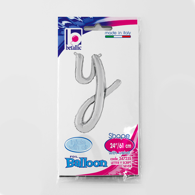 Foil balloon in shape of script letter Y in silver color. Balloons are in single pack.