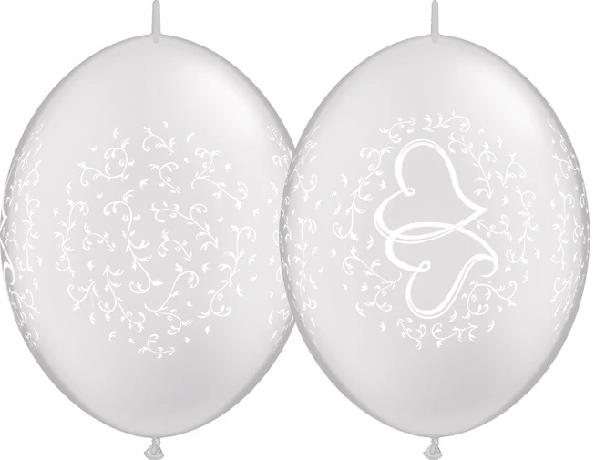 Connecting balloons in silver color with a white print of intertwined hearts, 50 pcs in a package.