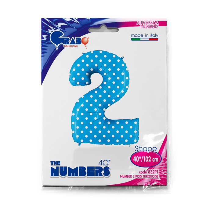 The foil balloon number 2 in turquoise color with white polka dots is 102 cm in size and is a suitable for the New Year and birthday decorations.