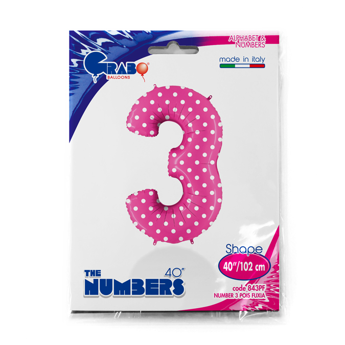 Foil balloon in shape of number 3 in pink color with white dots. Balloons are in single pack.